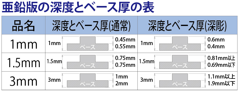 フナミズ刃型製版の亜鉛版は、厚みが以下の3種類あります。