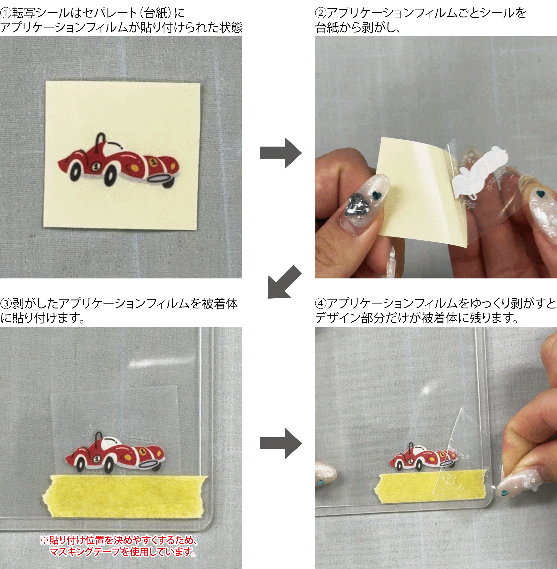 印刷されたデザインは透明フィルムごと素材に貼り付け、透明フィルムだけを剥がすことで絵柄やデザインのみを貼り付けることができます。